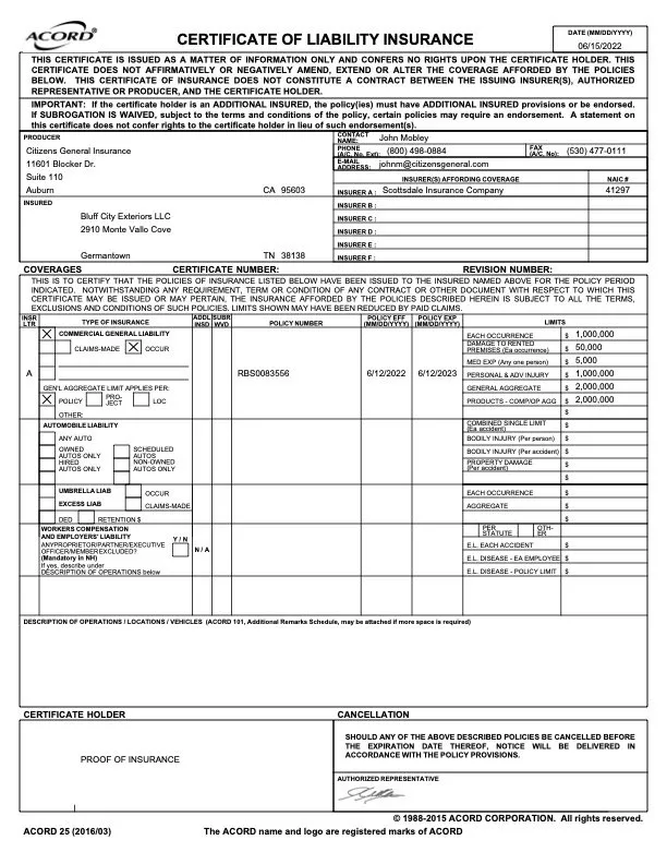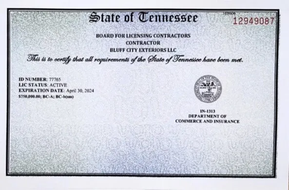 Please view the following documents to see our credentials as a licensed, qualified and insured Tennessee General Contractor.